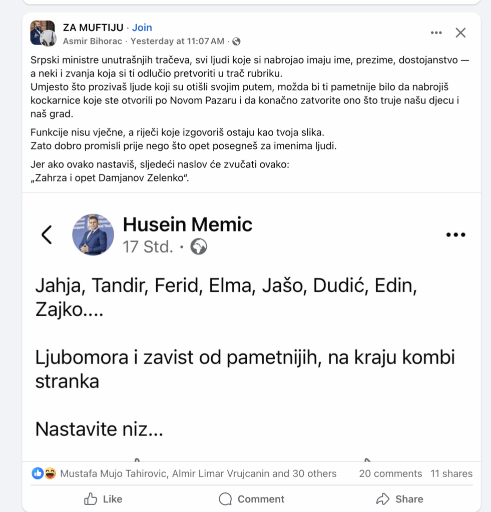 U svom komentaru, Bihorac je naveo da “svi ljudi koje je ministar nabrojao imaju ime, prezime i dostojanstvo”, te da ih Memićev status nepotrebno svodi na nivo trač-rubrike.