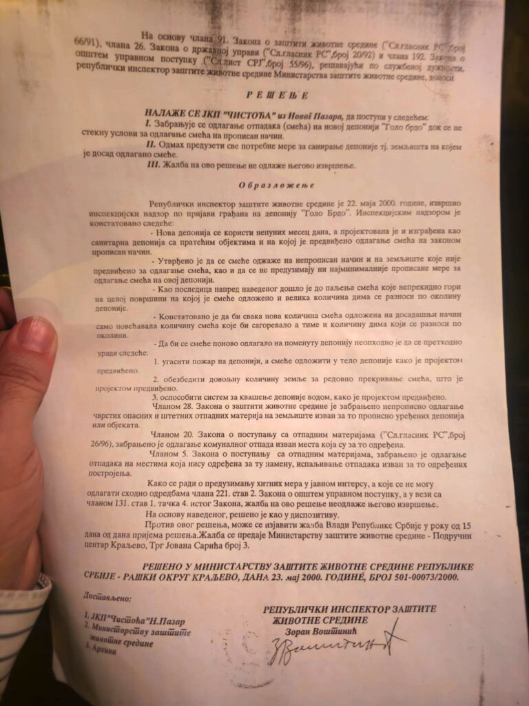 Dok se gust dim iz Golog Brda već mesecima nadvija nad Novim Pazarom, javnost je konačno suočena sa istinom koju su institucije čuvale pune dvije i po decenije. Još 23. maja 2000. godine Republički inspektor zaštite životne sredine izdao je rešenje kojim se zabranjuje odlaganje otpada na lokaciji Golo Brdo, sve dok se ne obezbijede propisani sanitarni uslovi. Potpis na tom dokumentu nosi inspektor Zoran Vasiljević, a u rešenju stoji i ključna rečenica: „Žalba ne odlaže izvršenje.“ Drugim riječima, zabrana je važila odmah.