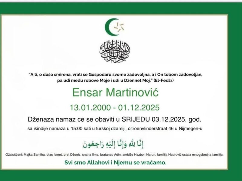 U Turskoj džamiji u Nijmegenu danas je klanjana dženaza-namaz tragično nastradalom Novopazarcu Ensaru Martinoviću, koji je poginuo u teškoj saobraćajnoj nesreći u Holandiji 1. decembra 2025. godine. Molitva je obavljena u srijedu, 3. decembra, nakon ikindije namaza, u prisustvu porodice, prijatelja i brojnih članova bošnjačke zajednice u dijaspori.