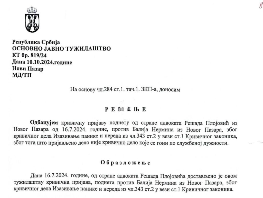 Osnovno javno tužilaštvo odbacilo je krivičnu prijavu protiv funkcionera Stranke pravde i pomirenja (SPP) Nermina Balije, koju je po nalogu Mirsada Ljajića, brata Rasima Ljajića, podnio advokat Rešad Plojović.