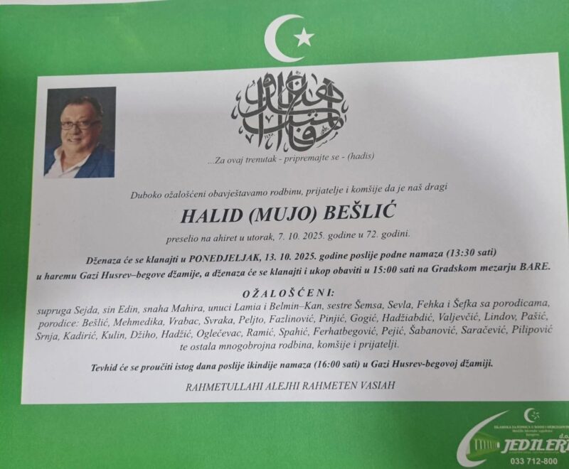 Prema objavljenoj smrtovnici, Halid (Mujo) Bešlić preselio je na ahiret 7. oktobra 2025. godine, u 72. godini života.