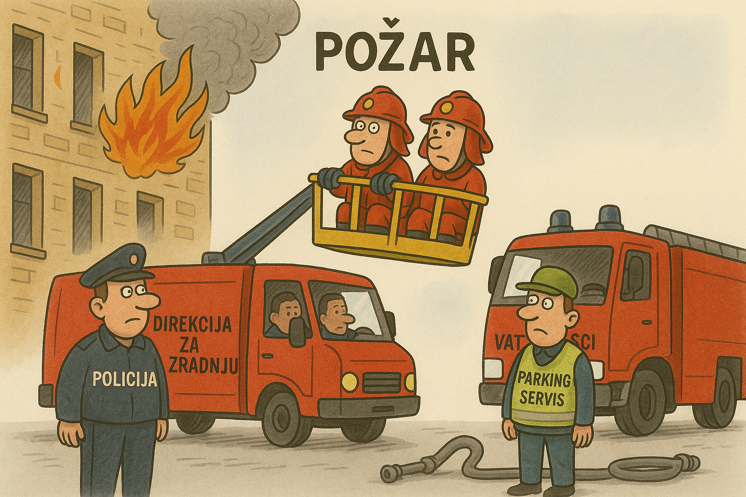 Ipak, prizor koji je najviše privukao pažnju građana bio je onaj koji se ponavlja iz godine u godinu: radnici Direkcije za izgradnju grada koriste svoju mehaničku korpu da priđu objektu zahvaćenom vatrom i pomognu u intervenciji, iako ta služba formalno nema nikakvu nadležnost u gašenju požara.