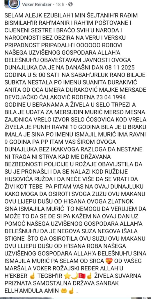 Ovu šokantnu informaciju objavio je član porodice na Facebook profilu „Voker RenDžer“, izazivajući eksploziju reakcija širom Sandžaka.